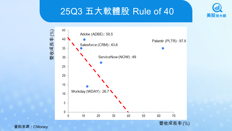 在評估 SaaS 公司體質時,市場常用的基準之一是「Rule of 40」。這個指標的計算方式很直觀:營收成長率加上獲利能力(通常是營業利潤率或自由現金流利潤率),若總和能超過 40%,代表公司在成長與獲利之間取得相對健康的平衡。在資金成本偏高、投資人風險意識提高的環境下,這個指標的重要性明顯上升。