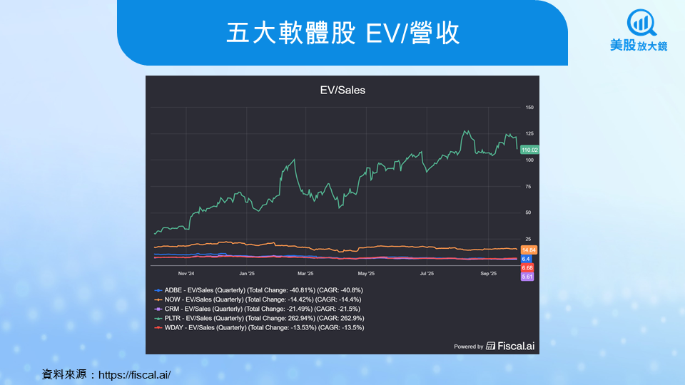 以 EV / 營收(EV / Sales)觀察,估值已被殺至歷史低點。Adobe (6.4x) 與 Salesforce (5.6x) 的營收倍數已回到極具吸引力的區間,相較於 Palantir 超過百倍的定價,這些掌握大量企業數據的老牌巨頭,目前正以「地攤價」在出售。這代表目前看到的是去泡沫,甚至是過度悲觀。