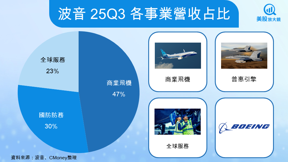 第三為全球服務業務,占營收約兩成出頭,涵蓋飛機維修、零件供應、工程支援與飛行訓練等項目。相較製造業務,全球服務具備較高毛利率與穩定現金流,是波音在景氣波動期間的重要緩衝來源,也被視為長期財務結構中最具防禦性的環節。