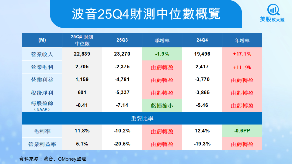 更值得注意的是獲利結構的變化。相較 25Q3 因 777X 一次性減損導致毛利與營業利益大幅為負,市場預期 25Q4 將出現明顯的帳面修復。營業毛利回升至約 27 億美元,營業利益轉正至 11 億美元水準,顯示在沒有大型減損干擾下,核心營運已具備基本的獲利能力。不過,在 GAAP 基礎下,每股盈餘中位數仍為 –0.41 美元,代表市場並未假設波音已全面轉盈,而是接受一個「虧損快速收斂」的過渡狀態。