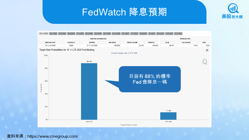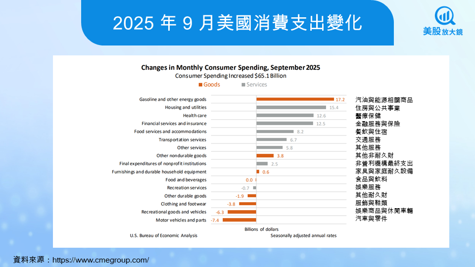 拆分 PCE 中的細項,商品價格在川普政府關稅政策延續的背景下維持較高漲幅,月增率達 0.5%。服務類別則呈現溫和態勢,增速從 8 月的 0.3%下降至 0.2%。食品與能源價格分別上升 0.4% 與 1.7%,推升整體 PCE 年增再度回到 2.8%。然而,消費者支出的動能逐月走弱。 9 月支出僅較 8 月成長 0.3%,實質消費甚至呈現零成長。這些指標說明通膨壓力並未全面消散,同時也反映家庭部門的負擔累積已開始抑制需求。