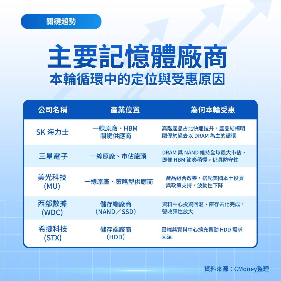 進入 2025–2026 年,記憶體族群成為美股中資金最集中的交易之一。從美光科技(MU)、SK 海力士,到西部數據(WDC)與希捷科技(STX),多檔個股在短時間內出現明顯的估值重評。市場的爭論焦點,並不在於需求是否存在,而在於這一輪上漲究竟是基本面轉折,還是又一次典型的循環高點。要回答這個問題,不能只看股價表現,而必須先釐清記憶體產業的角色分工、循環機制,以及本輪與過去不同的結構條件。