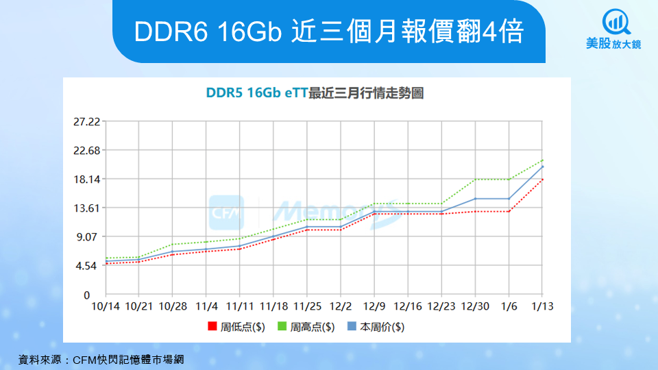 近期記憶體股價快速上行,並非單純情緒推動,而是來自價格結構的實質變化。以高階 DRAM 為例,DDR5/DDR6 16Gb 規格在近三個月內報價大幅上修,部分報價漲幅已達4倍之多,反映市場已進入明確的供不應求狀態。這不是單一產品的短期異動,而是高階記憶體產能被快速吸收後,價格向上調整的結果。