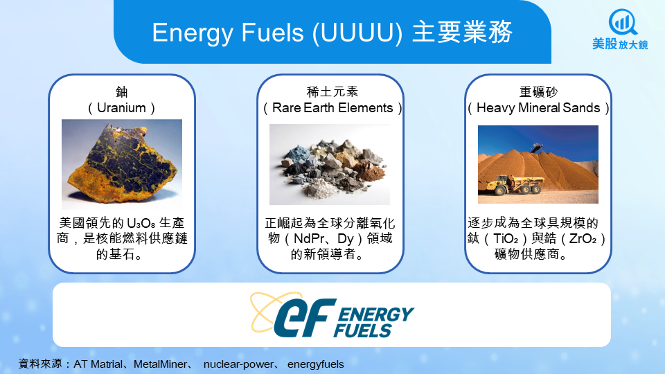 Energy Fuels(UUUU) 是美國最大的鈾生產商,同時也是少數擁有「從礦場到分離廠」完整供應鏈的關鍵礦物企業。公司核心業務涵蓋四大領域:鈾(U₃O₈)、稀土元素(REE) 與重礦砂(HMS),在美國能源安全與戰略礦物自主化進程中占據舉足輕重的地位。