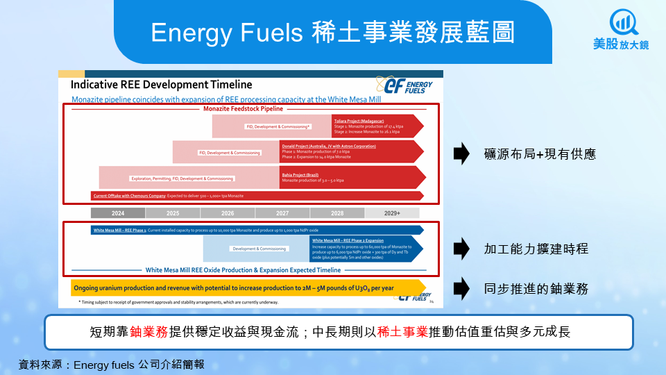 除鈾礦外,公司在稀土業務上也有明顯進展。猶他州白梅薩(White Mesa)分離廠於 8 月完成首批氧化鏑(Dy)中試生產,預計 11 月推出氧化鋱(Tb),2026 年第一季啟動氧化釤(Sm)中試。若中試順利,Energy Fuels 最快可於 2026 年底 利用現有產線小幅改造後,進入重稀土商業化生產階段,成為美國第一家能大規模分離重稀土氧化物的公司。