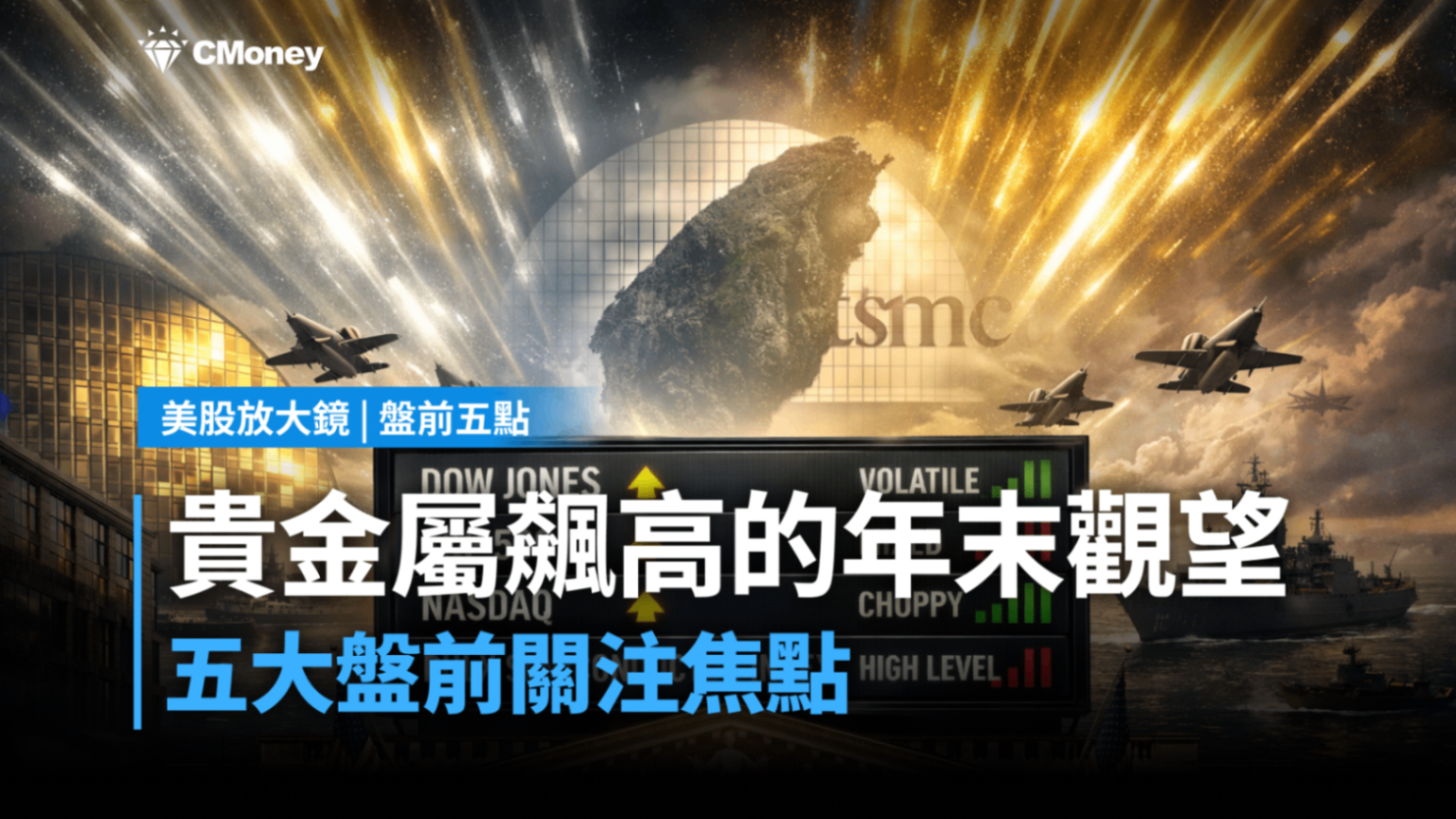 盤前指數期貨方面,S&P 500 期貨約跌 0.17%、那指期貨跌約 0.18%、道瓊期貨小跌約 0.05%,顯示市場在多項數據公布前略偏觀望。對台灣投資人而言,目前結構是:AI/半導體高檔震盪+貴金屬噴出+利率預期偏寬鬆+台海地緣風險升溫。台積電 ADR 上週五收在 302.84 美元、漲 1.35%,費半續在高位整理,短線仍利多費半與大型科技 ETF,但需留意貴金屬過熱與中國軍演對風險偏好的壓力。