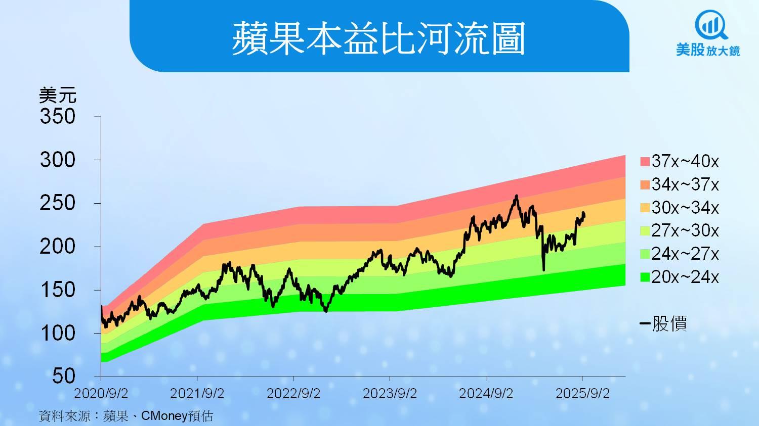 蘋果 9 月 9 日收盤價為 234.35 美元,以預估 FY2026 EPS 可達 7.98 美元推算,目前蘋果本益比為 29 倍,位於過往五年本益比 20~40 倍的中間偏低位置。CMoney 研究團隊考量: