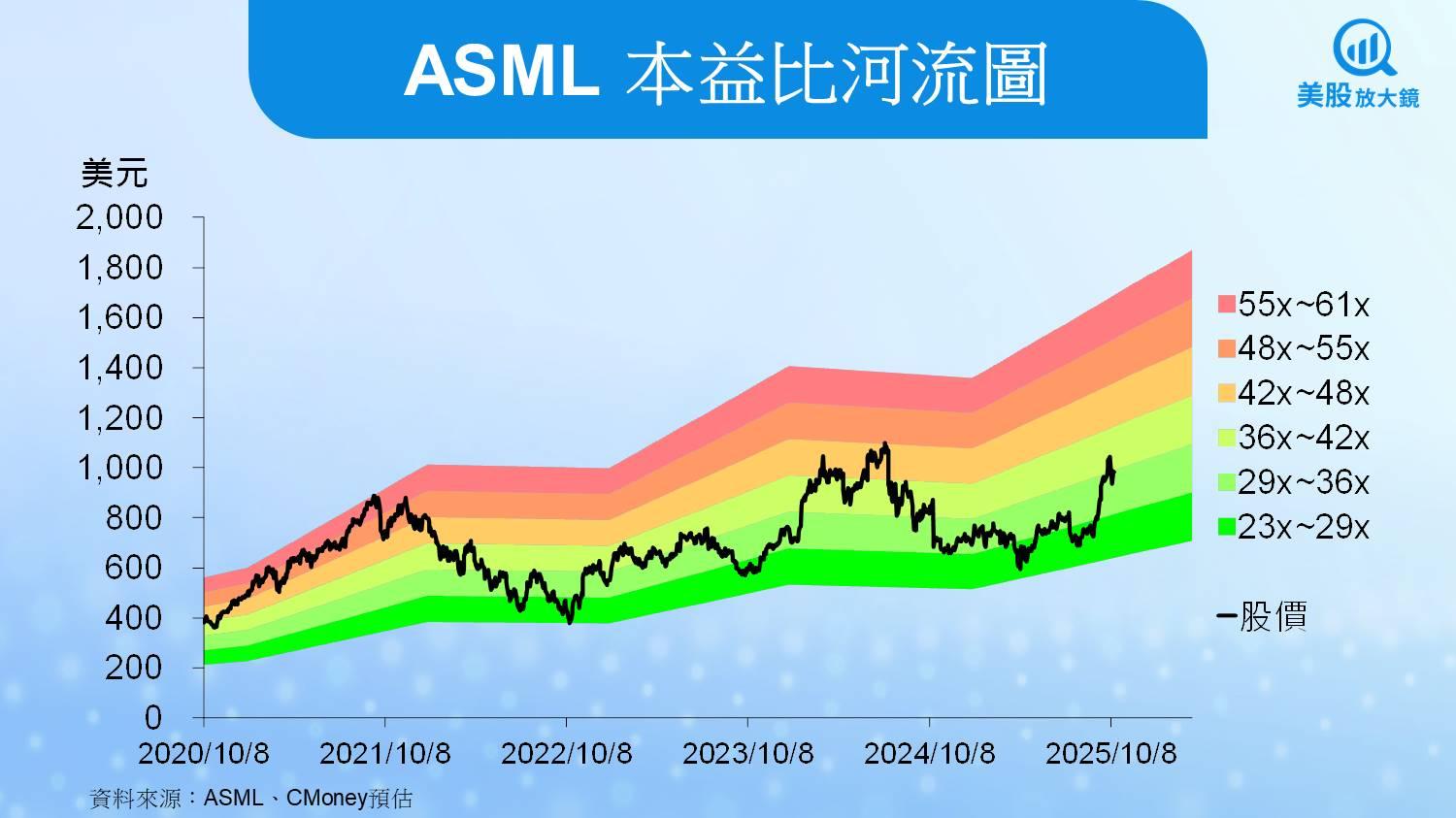 ASML 10 月 14 日收盤價為 983.18 美元。以 2026 年每股盈餘預估 25.35 歐元,搭配 EUR/USD 匯率 1.16 計算,折合為約 29.41 美元 EPS,目前股價對應本益比約 33 倍,介於過去五年本益比區間(23–61 倍)的偏低位置。整體評價尚未完全反映 High-NA 出貨擴大、EUV 滲透加速與 IBM 高毛利服務業務持續擴張的基本面改善。