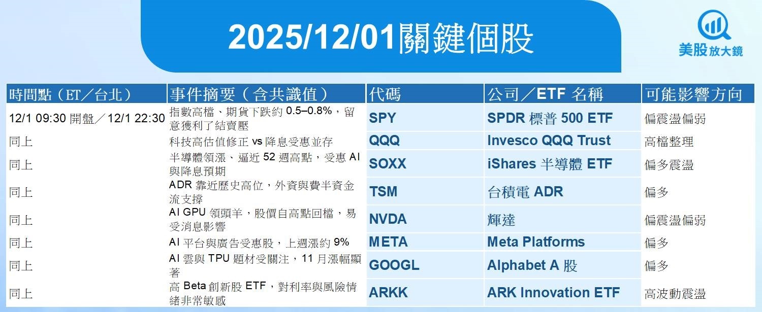今晚(美東 12/1 週一 9:30–16:00,台北時間 12/1 週一 22:30–翌日 05:00)重點在於:11 月 ISM 製造業指數、黑五線上銷售最終數據確認、以及對 12/10 FOMC 降息預期的再定價。對台灣投資人來說,費半 ETF SOXX、台積電 ADR TSM、以及 QQQ/ARKK/XRT 等 ETF 的資金流向,將是觀察「科技多頭能否延續、台股電子能否續攻」的關鍵線索。