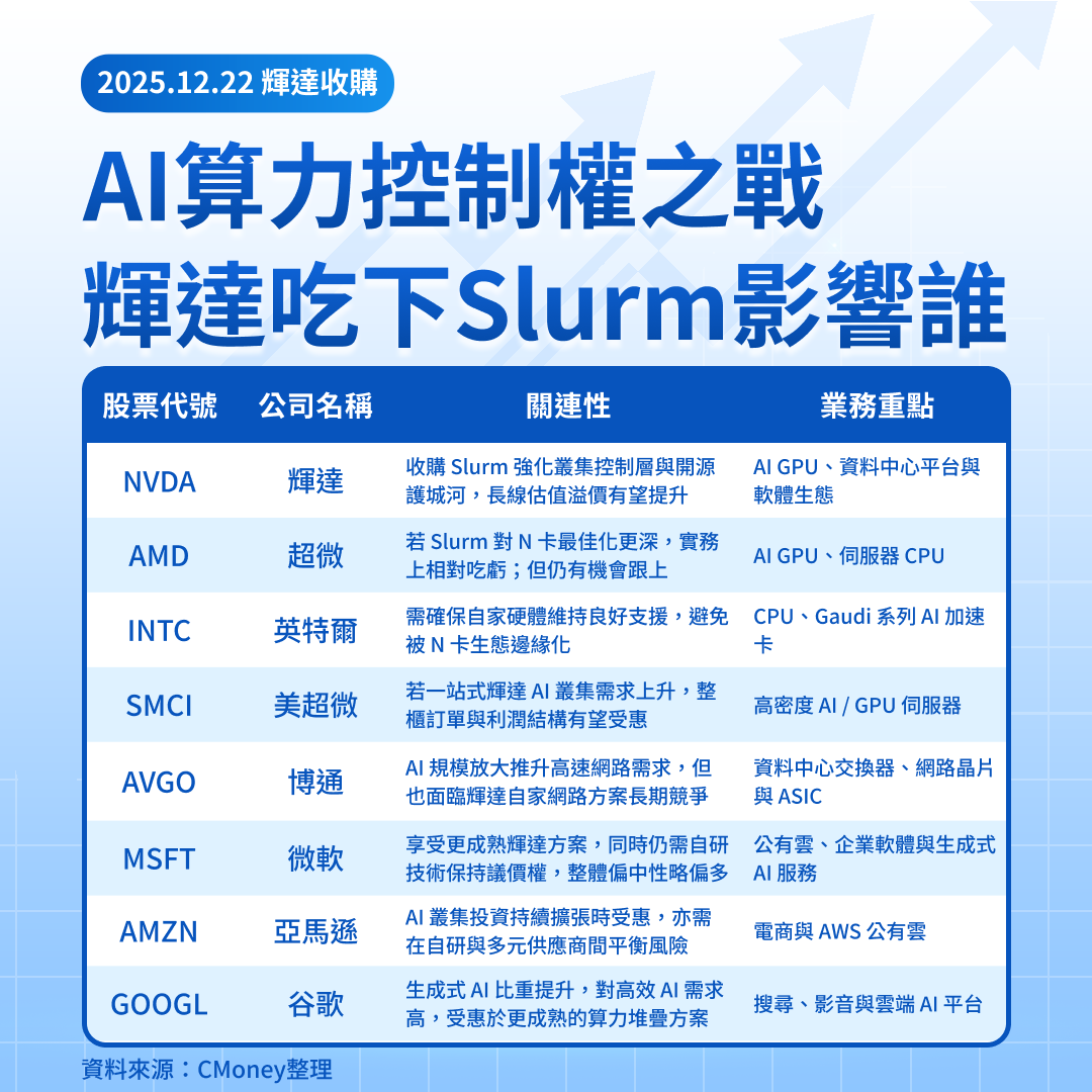 12/15,輝達(NVDA)宣布收購開源工作負載管理系統 Slurm 的主要開發者 SchedMD,並強調未來仍會維持 Slurm 的開源與供應商中立。