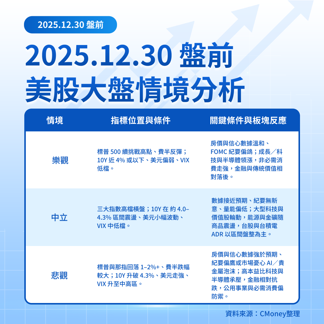 這反映年底資金正在「從擁擠的 AI 多頭部分移向防禦與實物資產」,對那指與費半短線壓力較大,卻支撐能源、金銀礦與部分防禦股。