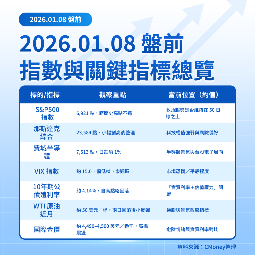 美東時間週三(1/7),S&P500 收 6,920.93,跌 0.34%,那斯達克漲 0.16%,道瓊跌 0.94% 至 48,996 點,漲多拉回,資金自金融、工業等循環股撤出,醫療保健與通訊服務相對抗跌。 費半指數 SOX 下跌約 1% 至 7,513 點,高位震盪。