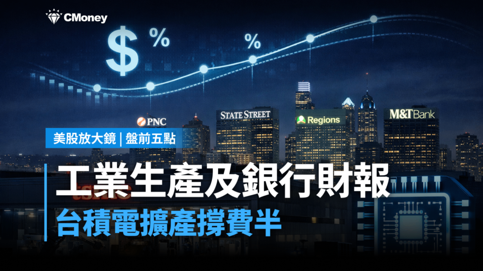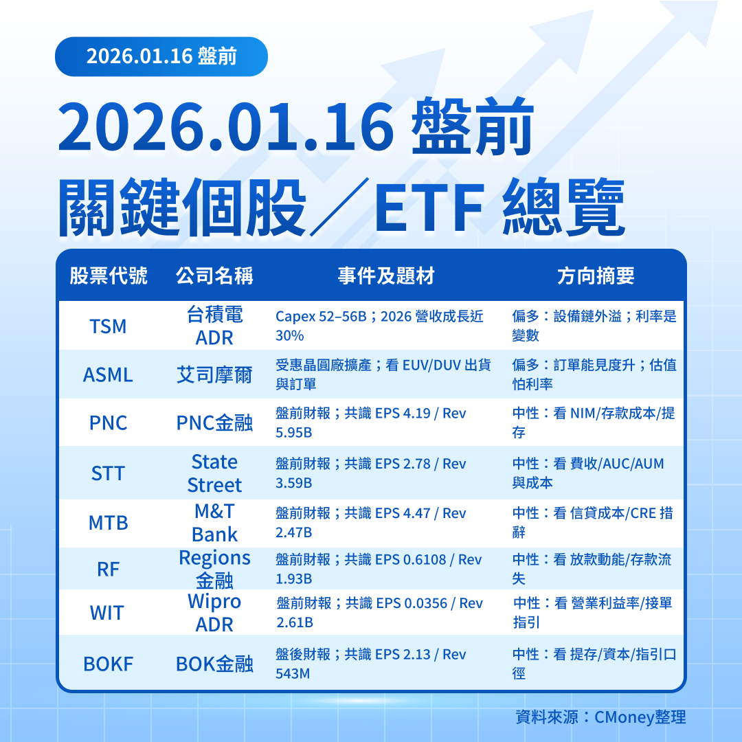 今天(01/16)重點落在:09:15 ET/22:15 台北:12 月工業生產、產能利用率;10:00 ET/23:00 台北:NAHB 房市信心。財報面:盤前 PNC/STT/MTB/RF(另含 WIT),盤後留意 BOKF(且下週一 01/19 美股休市,流動性與週末風險需納入)。對台灣投資人而言,台積電 ADR(TSM)與費半/半導體 ETF(如 SOXX)仍是盤前風險與契機的核心指標。