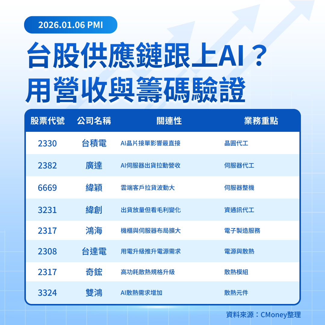 這次 PMI 告訴投資人一件事:傳統製造還在縮,短線容易被「訂單弱+成本高」拖住;但 AI 基建與電子相關需求,卻在同一張偏冷的報告裡顯得更有韌性。接下來策略不是硬猜大盤方向,而是把族群分清楚:工業股等訂單回溫再談攻擊,AI 基建盯住毛利與出貨節奏,誰能把成長變成獲利,誰就能走得更遠。