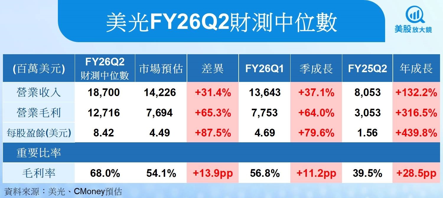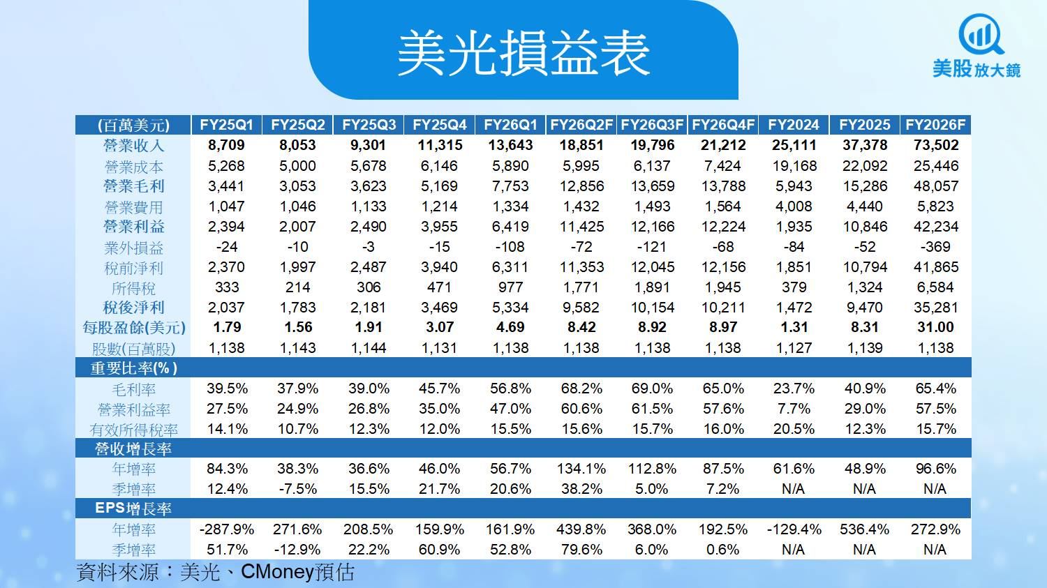 這將是美光史上營運最佳年度之一,單季 EPS 預估將穩定落在 7~9 美元區間,全年毛利率將維持 65%~68% 高檔。