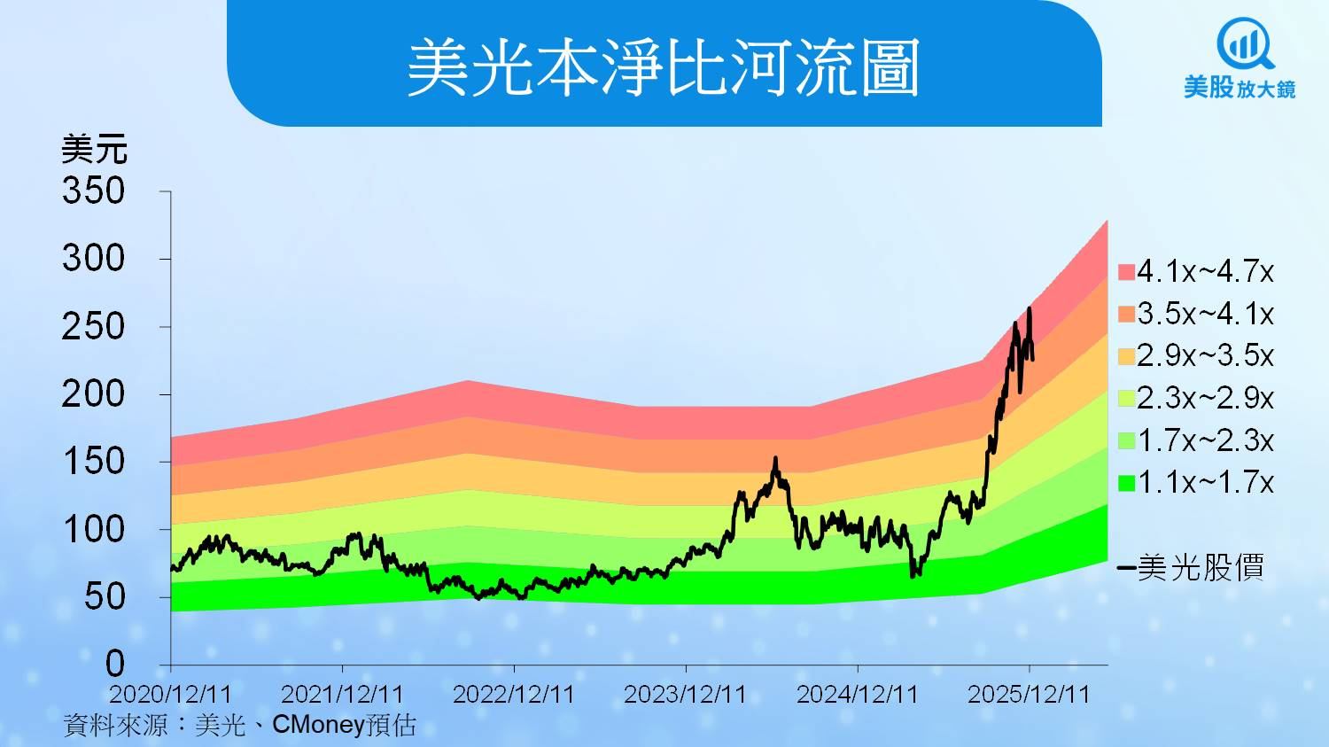 截至 2025 年 12 月 17 日,美光收盤價為 225.52 美元。以預估 2026 年每股淨值(BVPS)達 77.63 美元 計算,目前本淨比為 2.9 倍,低於過往五年本淨比區間(1.1x–4.7x)中位數。