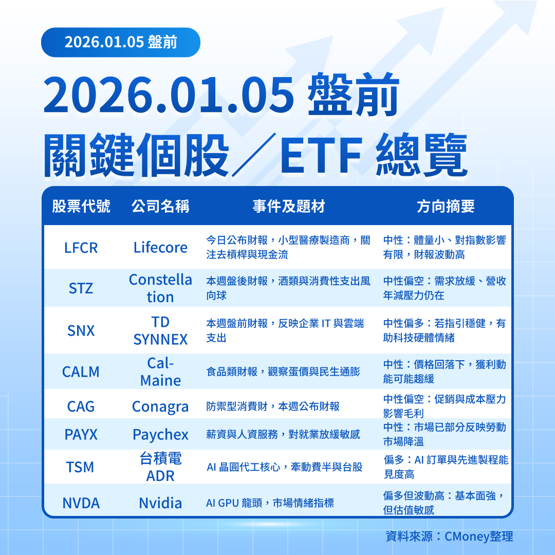 今日總經焦點在美國 12 月 ISM 製造業 PMI(10:00 ET/台北 1/6 23:00) 與 12 月總車輛銷售(14:00 ET/台北 1/6 03:00),市場共識 PMI 約 48 左右,仍低於榮枯線。財報面屬空窗期,沒有大型權值股公布。對台灣投資人而言,費半走勢、台積電 ADR 與科技 ETF 資金流向,仍是今日盤前最重要的風險指標。