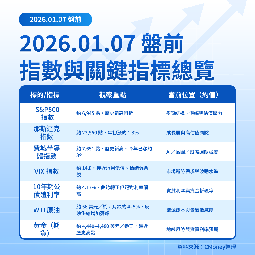 整體而言,目前美股仍站在多頭格局的上緣,短線風險主要來自「數據驚嚇+高位擁擠部位」,台灣投資人在參與 AI、半導體與美股高 beta 標的時,建議同時關注 VIX、10 年期殖利率與金價的同步變化,作為風險管理與持股調整的輔助訊號。