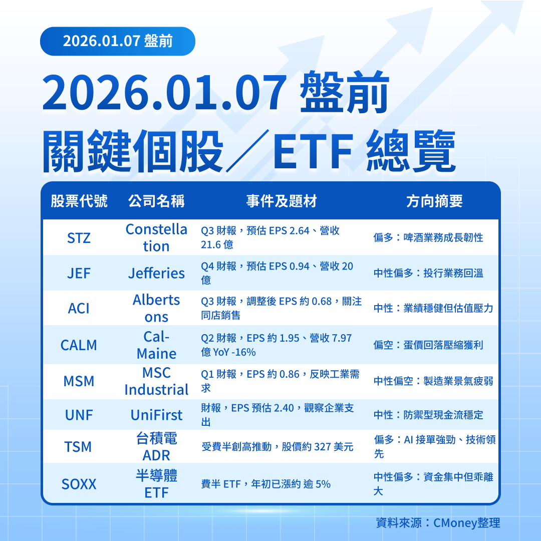 財報方面,盤前有 Albertsons(ACI)等零售、防禦型個股,盤後則由啤酒巨頭 Constellation Brands(STZ)與券商 Jefferies(JEF)領銜,正式揭開 2026 年度財報季序幕。