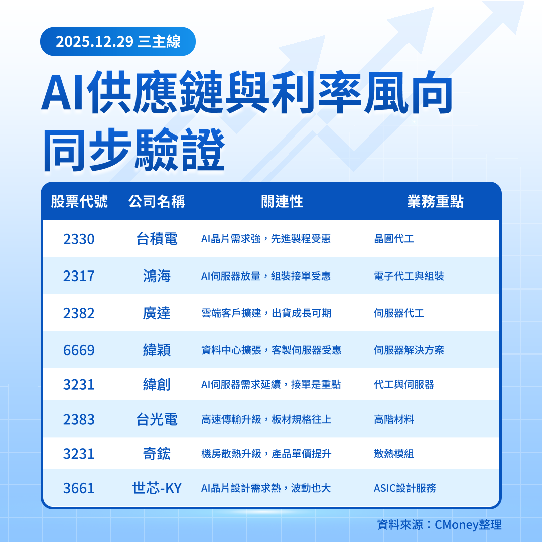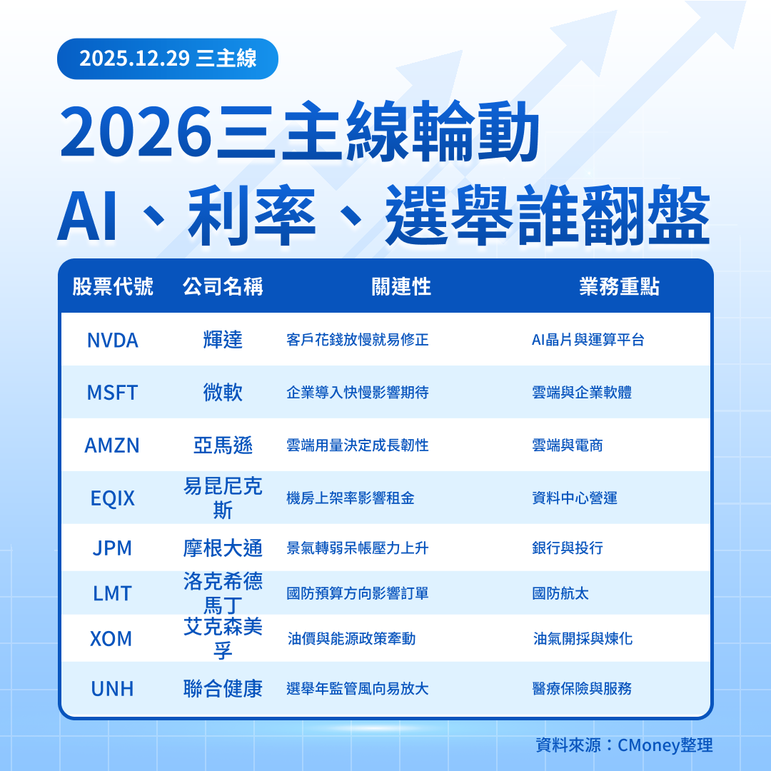 2026 最難的不是找題材,而是三條主線輪流主導,讓你以為行情穩、其實主角隨時換人。投資人真正要做的是:AI 盯「花錢速度」、利率盯「降息原因」、選舉盯「政策風向」。把這三件事固定追蹤,你就更不容易被震盪洗掉,反而更能在輪動出現時提早站上節奏。