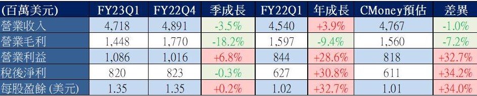 通用磨坊 FY23Q1因出售品牌獲利甚豐,稅後淨利雖略低於 FY22Q4 歷史高點 (季減 0.3%),但仍年增 30.8% 達 8.20 億美元,每股盈餘 (EPS) 更達 1.35 美元 (季增0.2%、年增 32.7%),大幅優於CMoney預期的1.01美元 34.0% 及市場預期的 1.00 美元 35.3%。