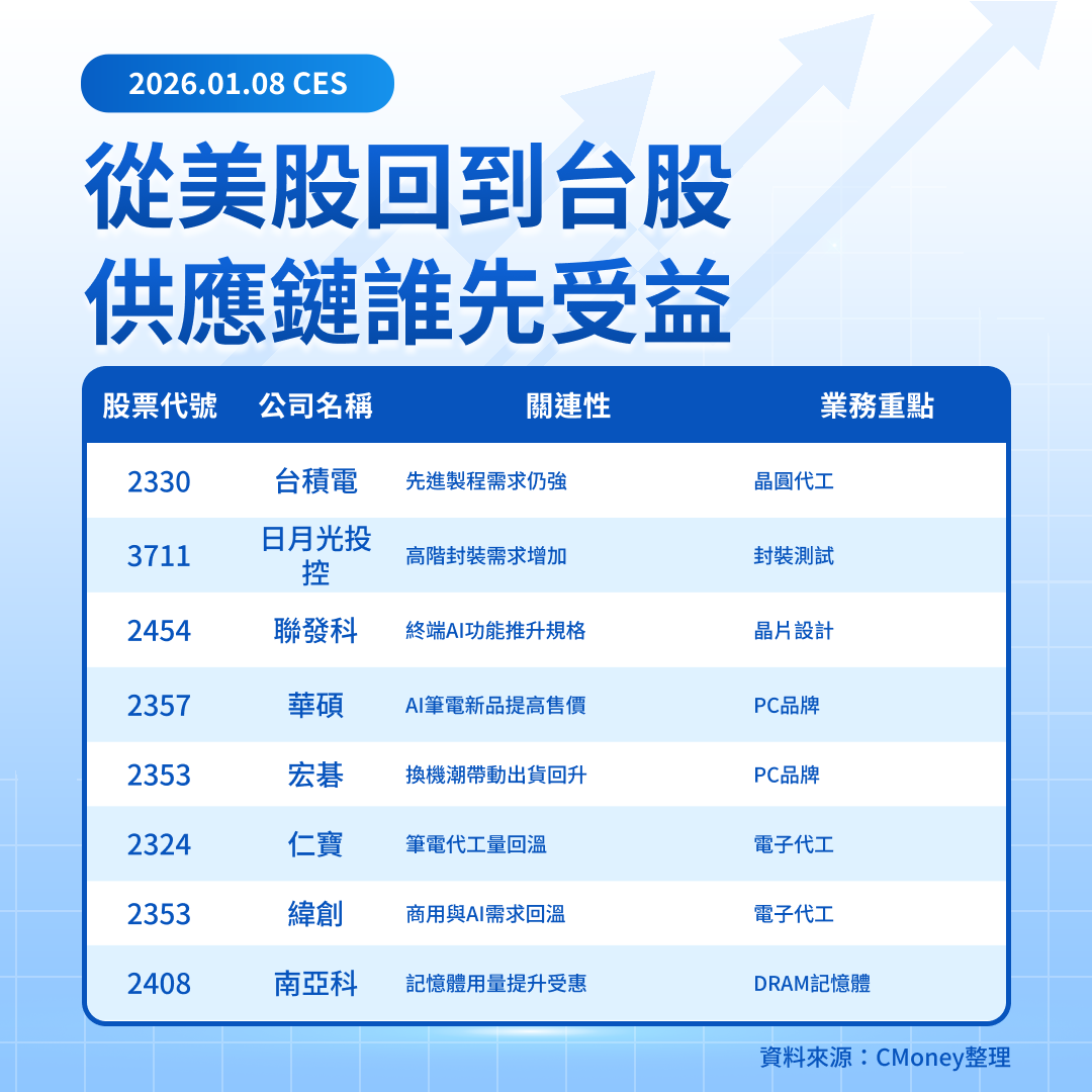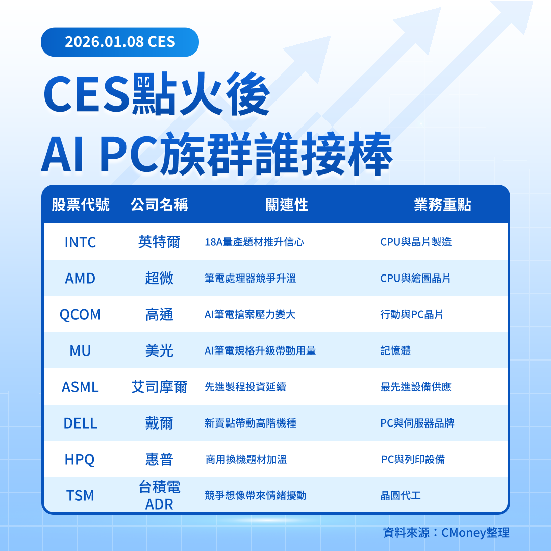 這次 CES 讓英特爾把 18A 從「大家在猜」推進到「開始能驗證」,所以股價用放量大漲回應。後續行情的核心不是再聽一次發表會,而是看實機評測與出貨能不能持續加分、公司對成本與獲利路線能不能講得更清楚;只要驗證沒有掉鏈子,AI PC 族群就有機會從單一個股擴散成輪動主線。投資人更務實的做法,是把族群放進自選,讓走勢與量能告訴你誰在變強、誰只是蹭熱度。