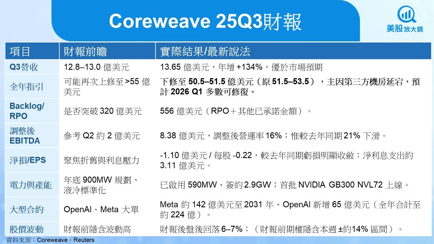 一句話總結:CoreWeave(CRWV)Q3 營收與訂單積壓全數超標,營收年增達 134%,但因第三方資料中心延宕,下修全年營收預期至 50.5–51.5 億美元,導致盤後股價由漲轉跌、震盪劇烈。