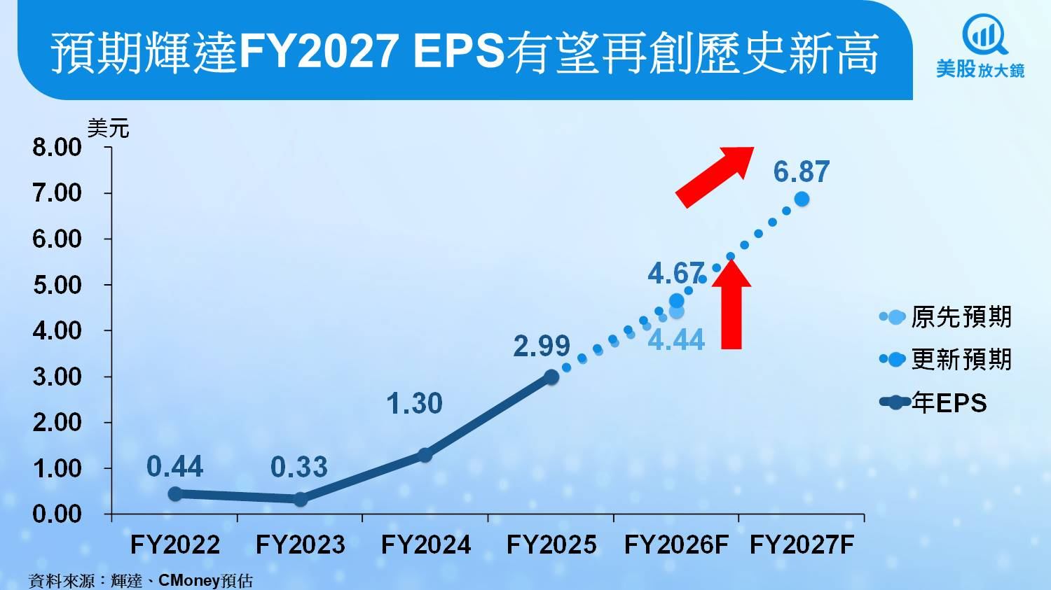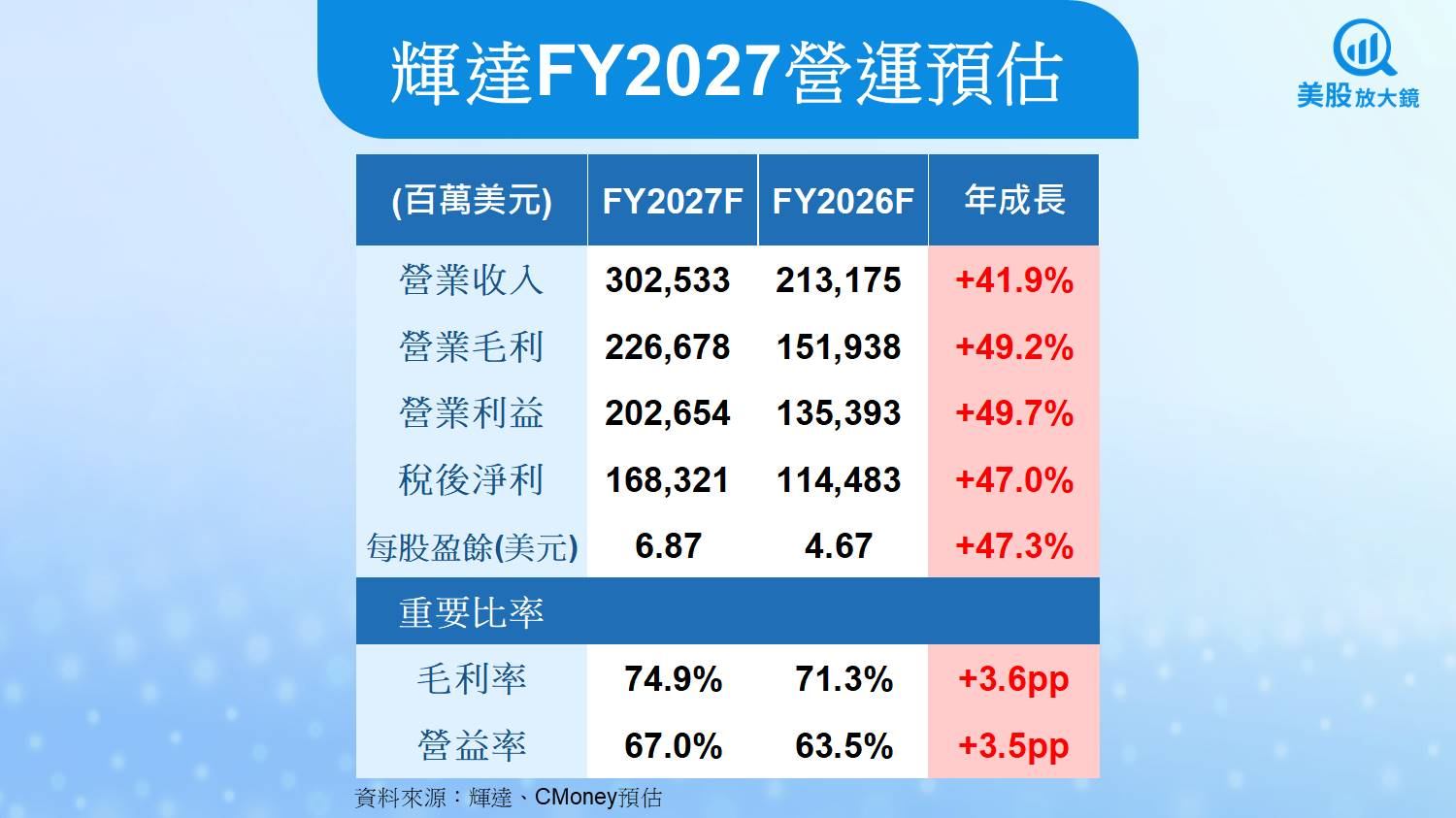 因此,CMoney 預估輝達 FY2027 年營收可達 3025.3 億美元,年增率高達 41.9%,預期將由 Rubin 架構正式接棒成為主要貢獻來源,並與 Blackwell 架構形成雙平台共存格局。預期EPS 可望年增 47.3% 達6.87 美元,,反映高毛利的資料中心業務仍將占營運主軸。
