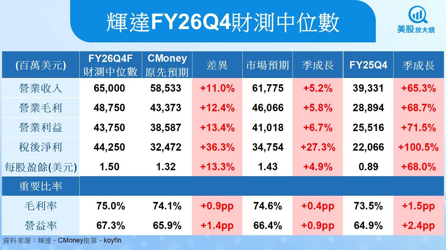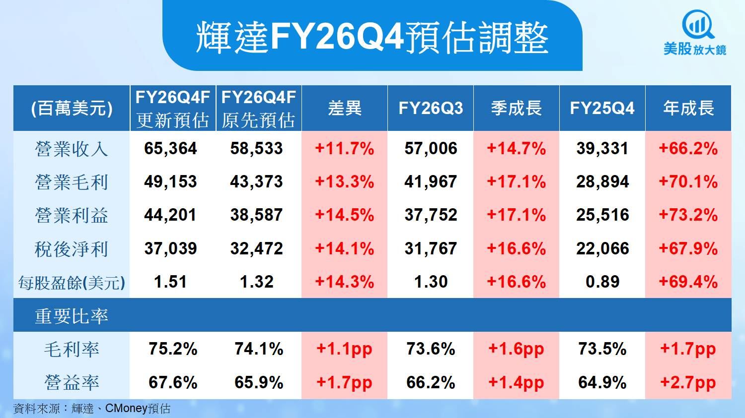 輝達預估 FY26Q4 GAAP 毛利率為 74.8%、非 GAAP 為 75%,皆高於 Q3 的 73.4% 與 73.6%。CMoney 隨後也將預估毛利率上調 1.1 個百分點至 75.2%,預期季增 1.6 個百分點、年增 1.7 個百分點,反映 Blackwell 架構良率提升、產品組合優化與資料中心佔比持續提高所帶來的獲利能力提升。