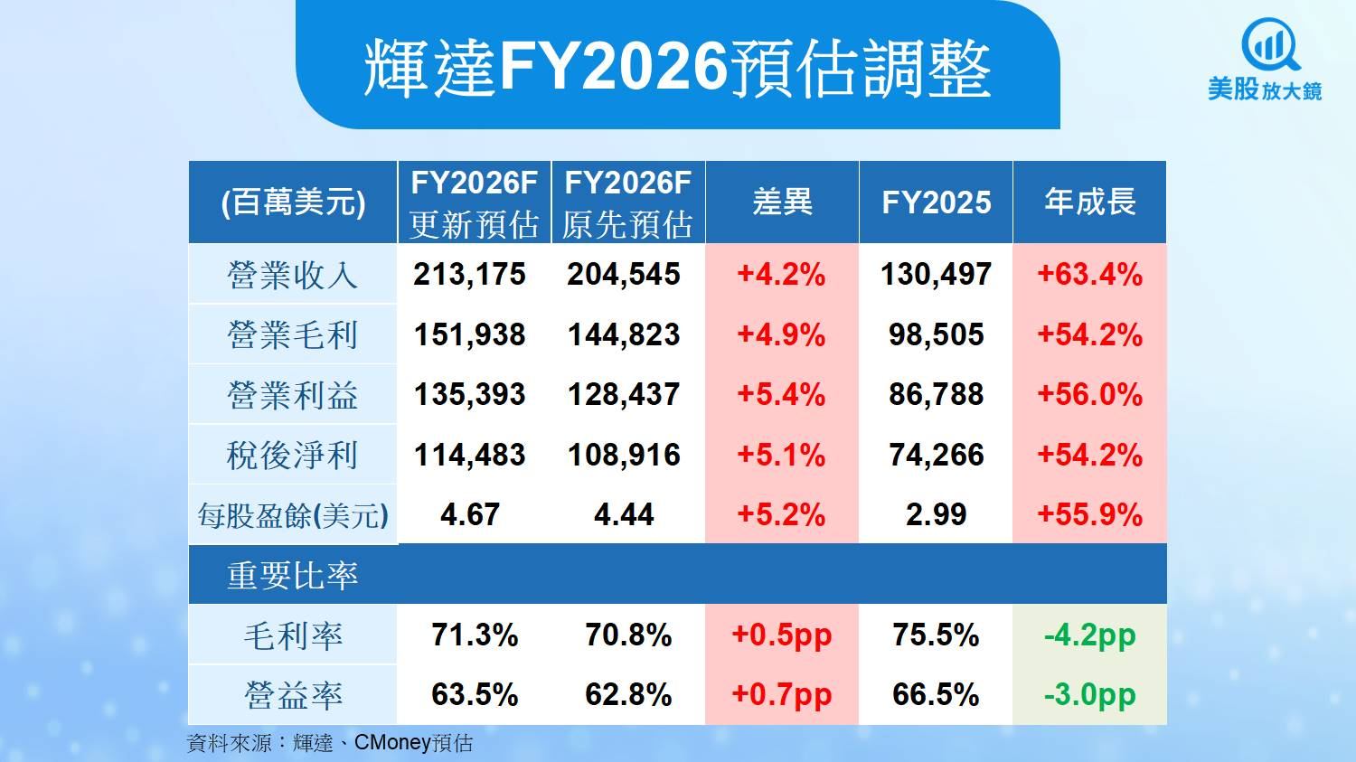 受惠於 Blackwell 架構快速放量與資料中心需求強勁延續,故將輝達 FY2026 全年營收預估由原先的 2045.5 億美元上修至 2131.7 億美元,年增率達 63.4%;毛利率預估則上調 0.5 個百分點至 71.3%,儘管年減 4.2 個百分點,仍屬高獲利水準。