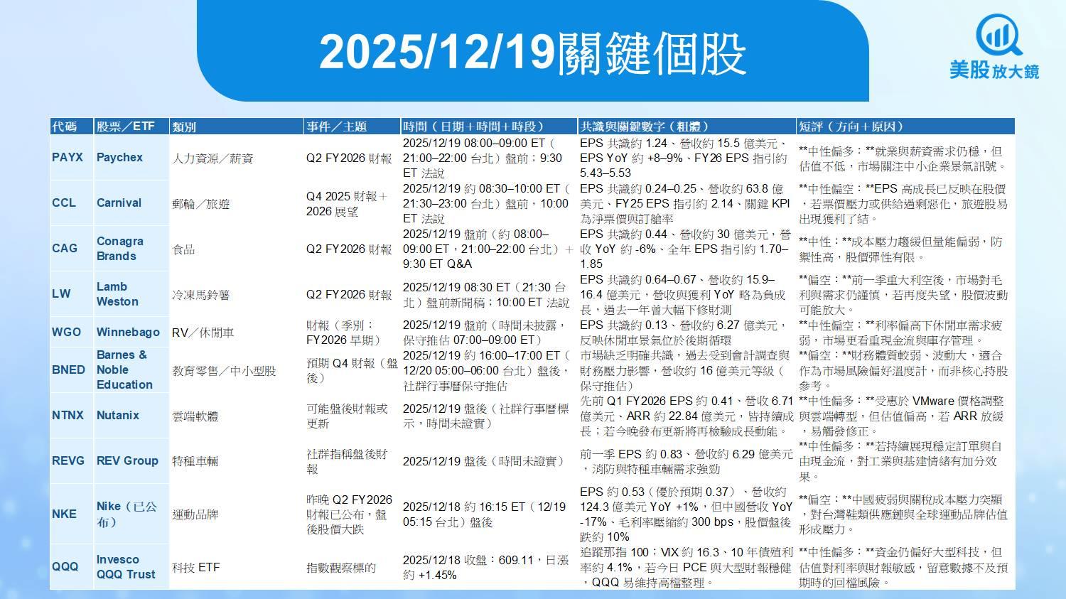 專業觀察:今日盤前財報集中於就業服務(PAYX)、旅遊(CCL)、食品與餐飲供應鏈(CAG/LW)、休閒耐久財(WGO),可視為對消費結構與成本壓力的一次「小型體檢」,若整體指引偏穩,對已因通膨降溫而轉多的市場情緒屬加分。