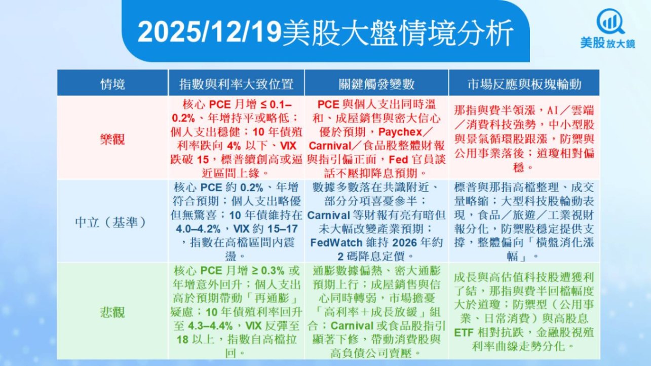 今日(2025/12/19,週五)盤前關鍵在 8:30 ET(台北 21:30)的核心 PCE、個人所得/支出,以及 10:00 ET(台北 23:00)的成屋銷售與密大信心最終值,將直接牽動利率預期與美股高估值科技股。
