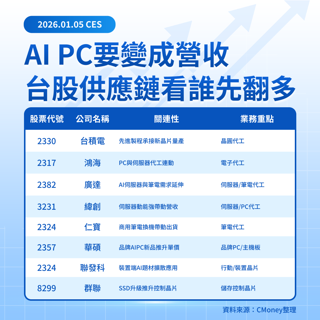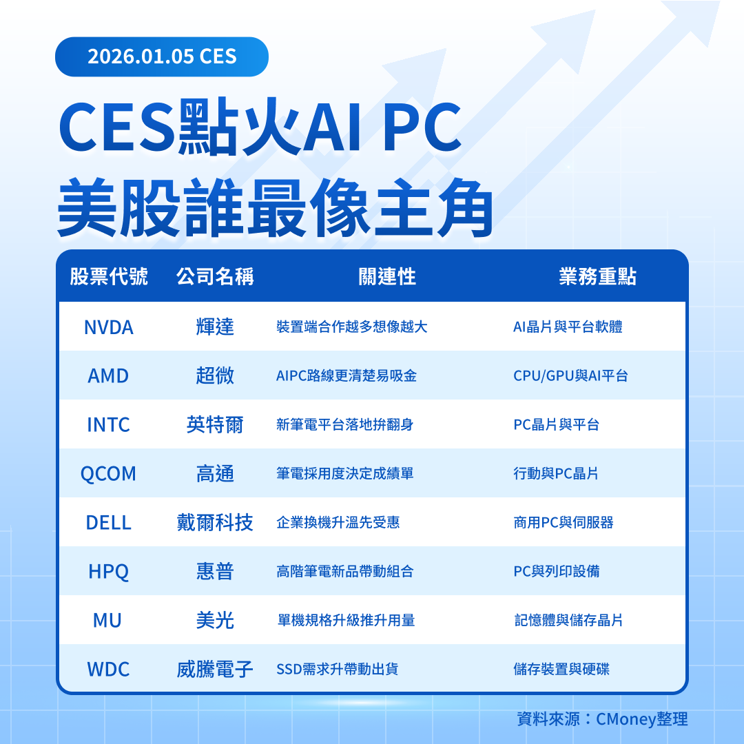 雲端 AI 這兩年資金高度集中,大家盯少數龍頭就夠;但 AI PC 與裝置端 AI 一旦被市場當真,受惠就會從「少數幾家」擴散到「一整條供應鏈」。這就是 CES 的真正價值:它讓資金開始測試要不要把焦點從機房,分流到筆電與終端裝置。