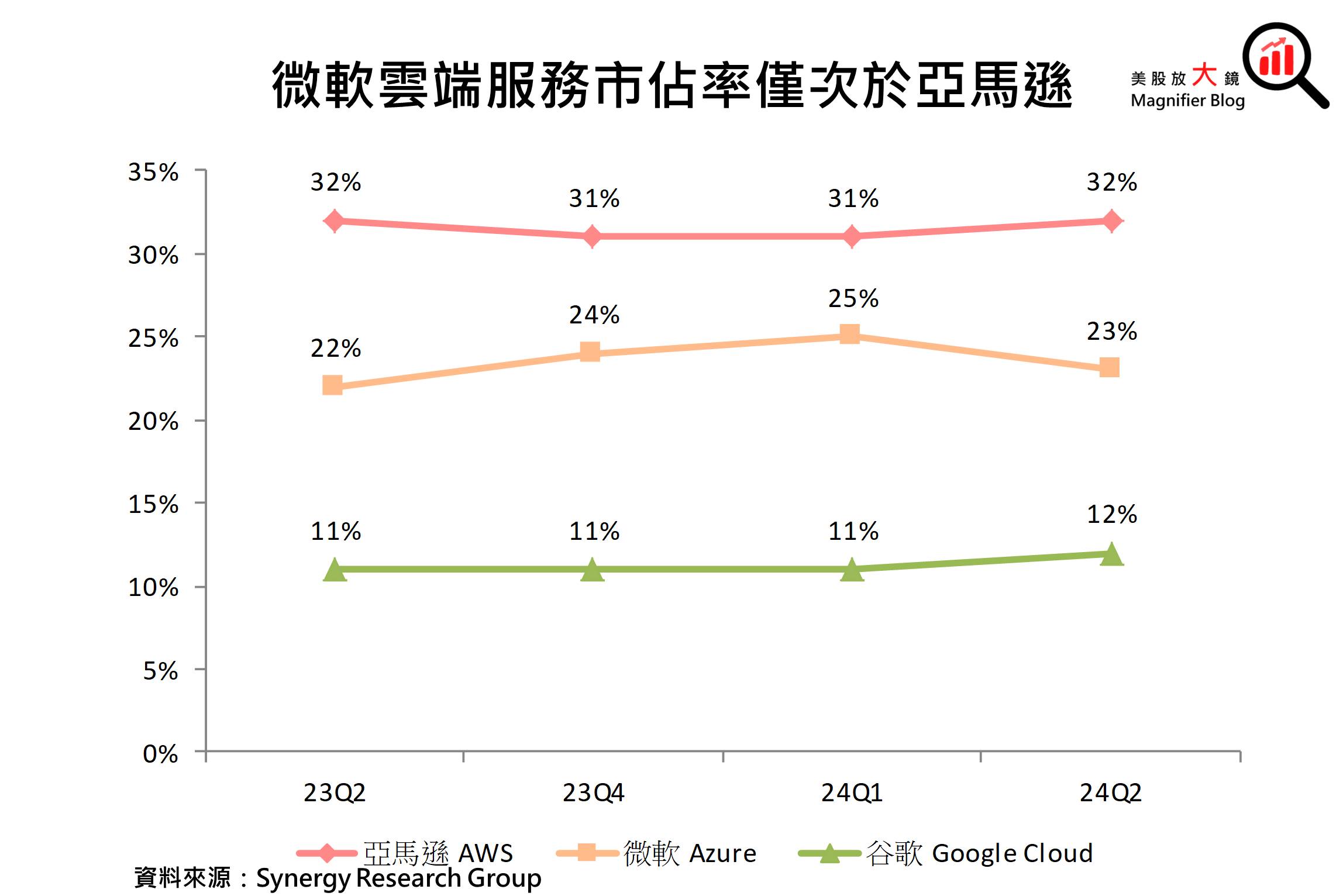 發展至今微軟的核心產品包括Windows作業系統、Office辦公軟體套件和Azure雲端服務,這些都是微軟最具代表性的軟體產品。除此之外,微軟也推出了Xbox遊戲主機等硬體設備,並涉足企業服務、遊戲娛樂等領域,成為全球企業和消費者不可或缺的科技夥伴。特別是Office軟體組合包成為了辦公領域中的重要工具,幾乎是每個現代工作場所的必備軟體。另外,微軟在全球軟體和雲端市場佔有穩固地位,其Azure雲端服務不僅是目前企業數位轉型的重要工具,也成為與亞馬遜(AMZN) AWS競爭的主要利器。Azure雲端服務24Q2 市佔率為23.0%,僅次於亞馬遜AWS的32.0%。