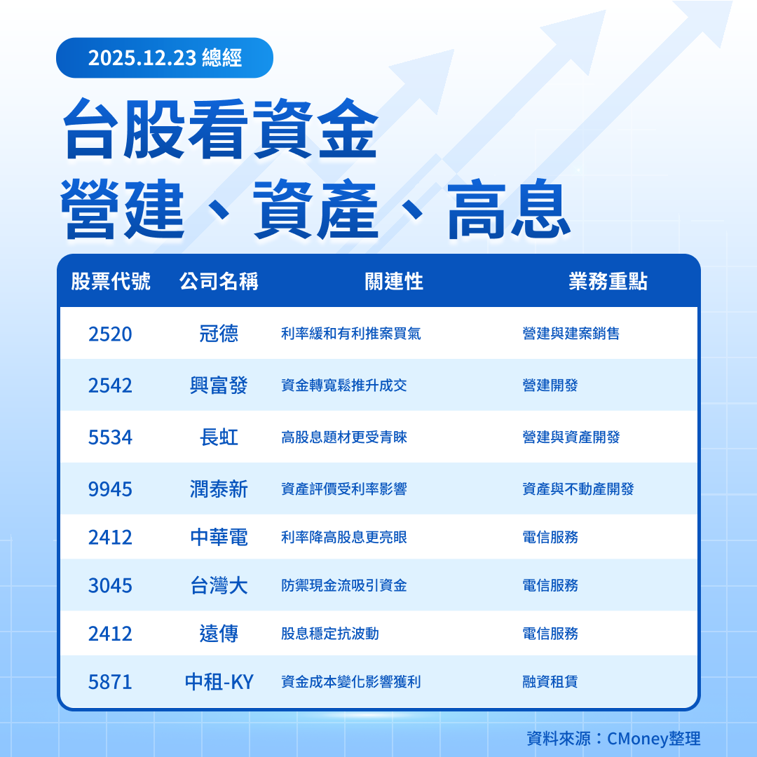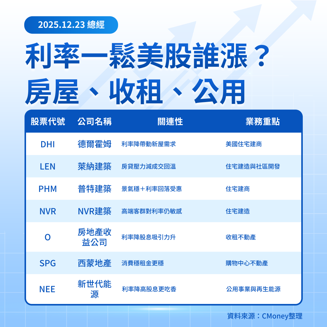 代表性的方向會落在三種:房屋建築股、收租型不動產公司、以及公用事業類股。房市最怕利率,利率一降,房貸壓力小,成交與新屋需求的想像就會回來;收租型不動產公司靠穩定租金吃飯,利率壓力小時,股息吸引力更容易被放大;公用事業則是典型「穩穩走」的現金流,利率下降時常被當成資金停泊點。