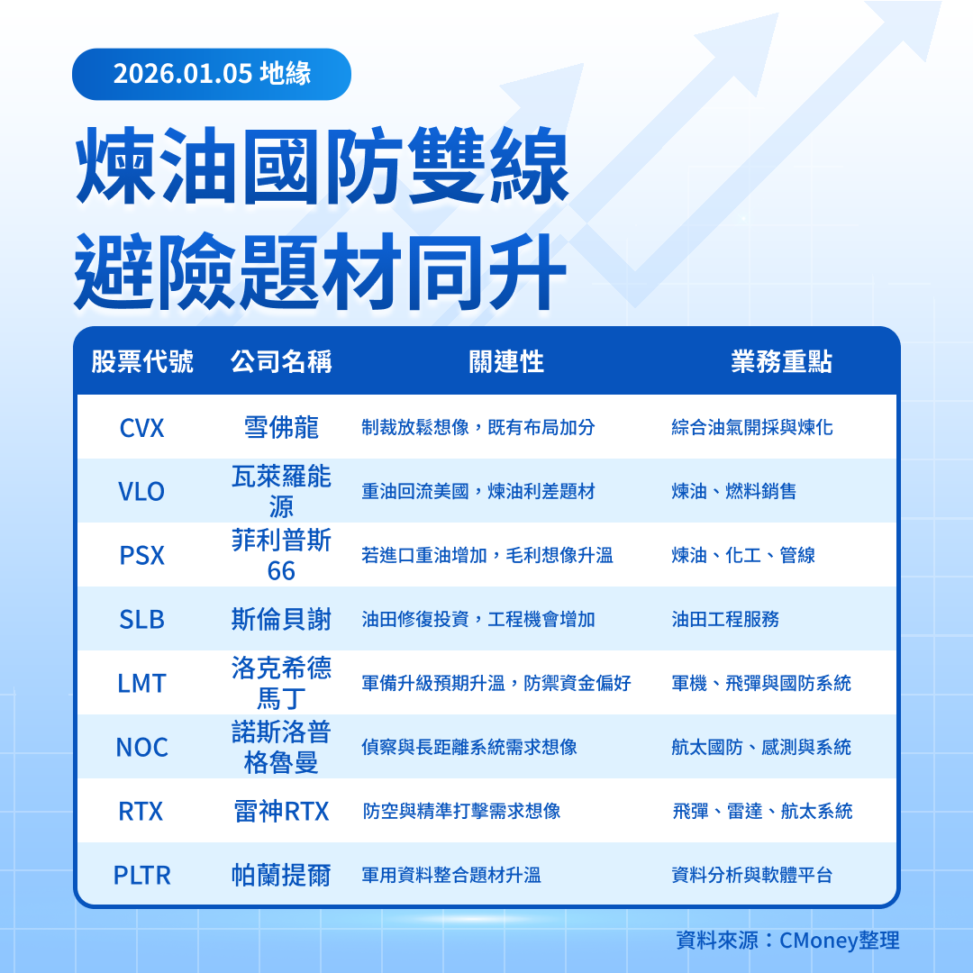先看能源:委內瑞拉的重油,過去很適合美國墨西哥灣沿岸的煉油廠;如果未來油流向從其他買家轉回美國,受惠的往往是能處理重油的煉油廠,這也是「煉油股題材」比「挖油股題材」更直接的原因。