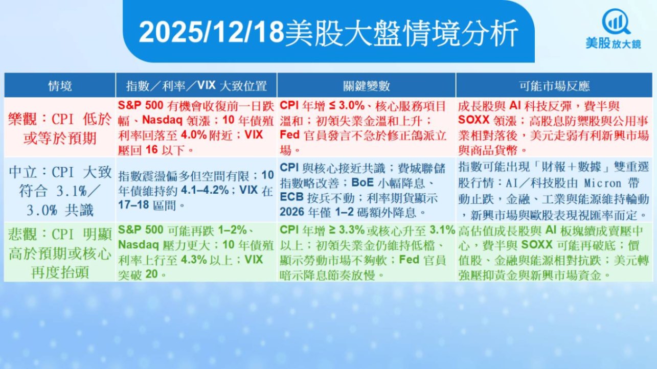 美東時間 12/18 08:30(台北 12/18 21:30),美國將公布 11 月 CPI。共識預期:年增約 3.1%、核心年增 3.0%、月增 0.3%,是 Fed 近期釋出較溫和訊號後的第一份通膨大考。這次數據因前期延宕,頭條焦點落在「年增率是否守在 3% 附近」。若落在或低於共識,殖利率有機會再壓低,成長股壓力緩解;反之高於 3.1%,市場對後續降息節奏的期待恐再度降溫,高估值科技與成長股可能續受壓。