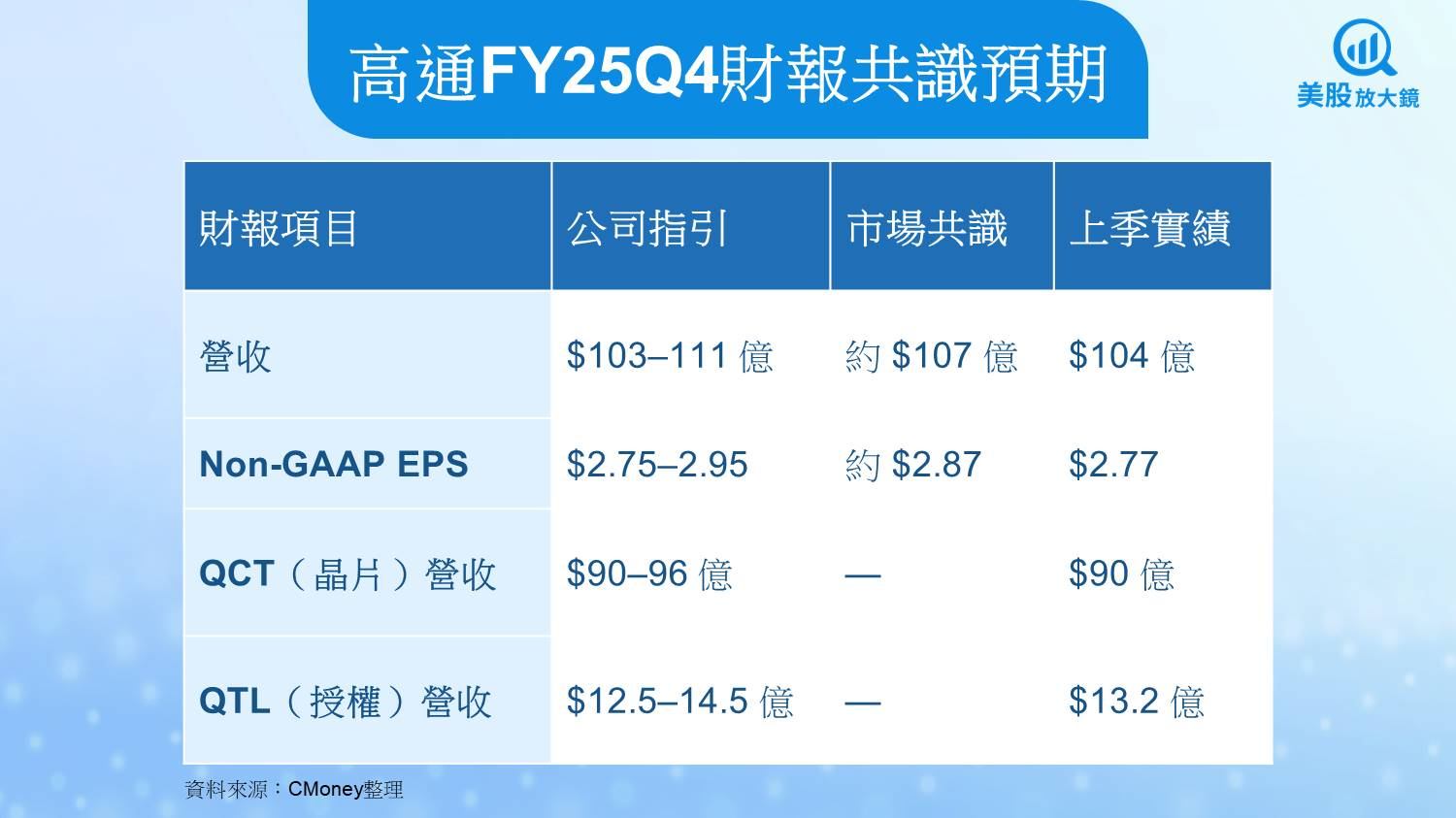 整體來看,預期高通本季可穩穩達標,但若營收與 EPS 落在區間中值、指引又保守,恐難激勵股價。反之,若 EPS 靠近 $2.95 高端、AI/非手機營收增長明確,則可能成為年底資金加碼契機。