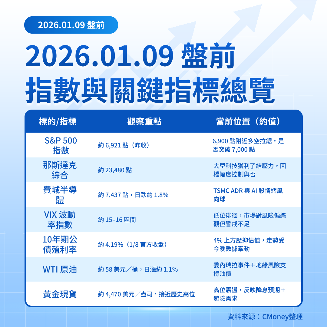在實質利率回落與地緣風險(委內瑞拉政局、油輪遭扣押)背景下,黃金價格在 1/9 早段仍約每盎司 4,470 美元附近、接近歷史高檔,WTI 原油則約 58 美元/桶,較前一日上漲約 1%。VIX 仍在 15 左右低檔徘徊,顯示股市對短線風險仍相對淡定。
