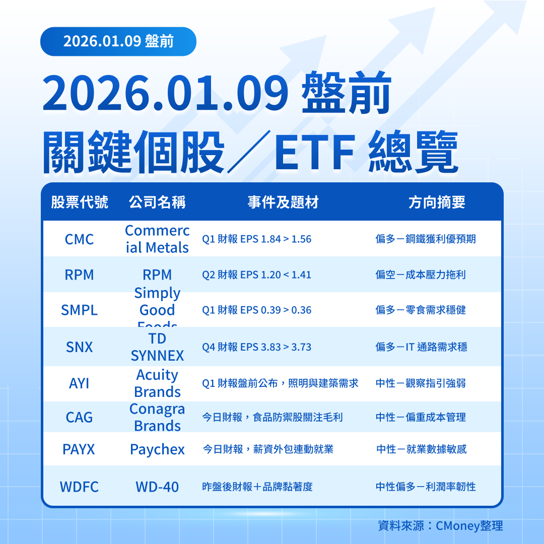 本週財報由工業與消費股領銜。Commercial Metals(CMC)Q1 EPS 報 1.84 美元,優於預期 1.56,美股盤前股價偏多反應,顯示鋼筋與金屬需求仍具韌性。RPM International(RPM)Q2 調整後 EPS 1.20,低於預期 1.41 並較去年衰退,盤前股價約跌 4–5%,反映成本壓力與利潤率受擠壓。