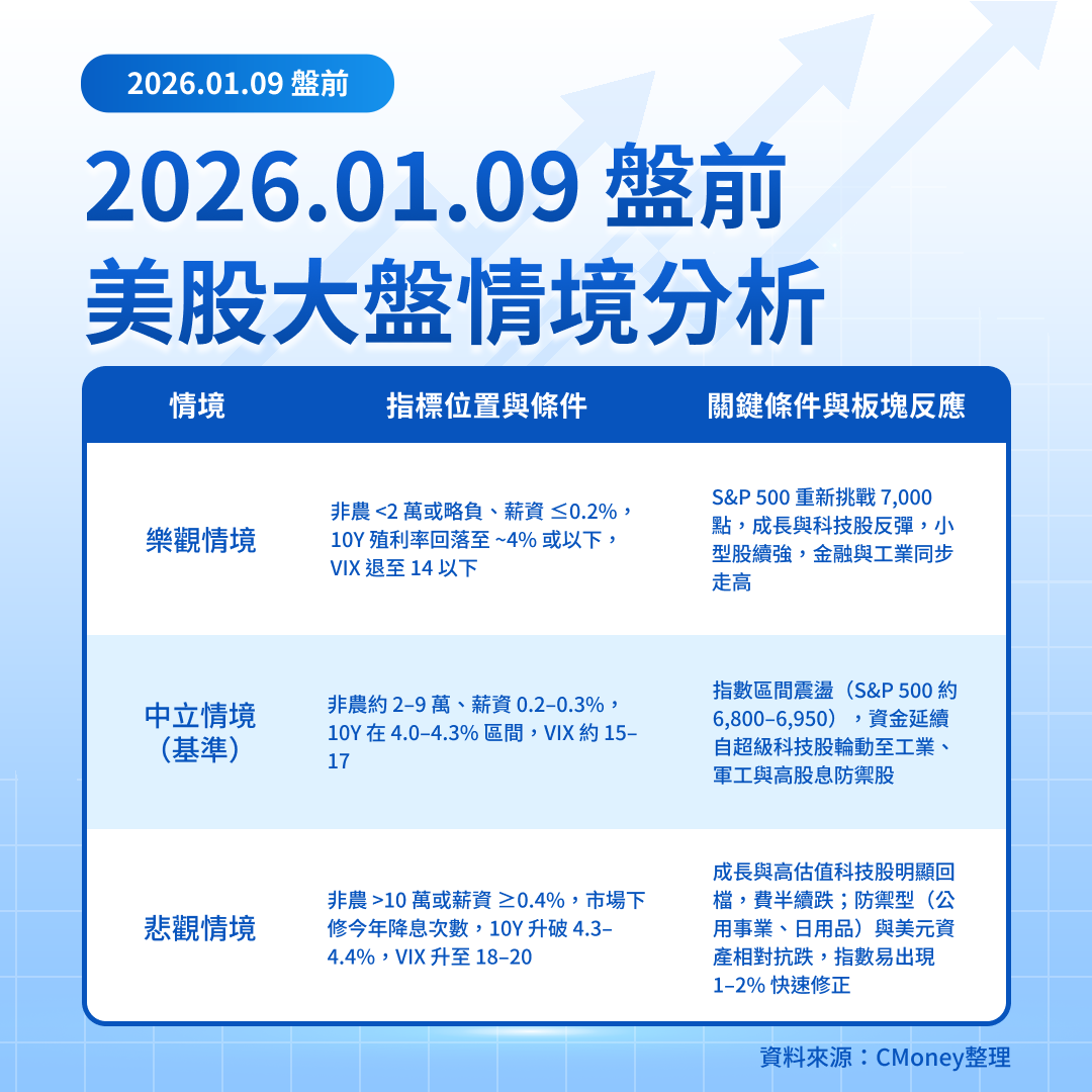 今日最關鍵是美國 12 月非農就業報告(08:30 ET/台北 21:30)及 1 月密西根大學消費者信心初值(10:00 ET/台北 23:00),數據將左右 1 月 FOMC 是否續按兵不動與今年降息路徑。