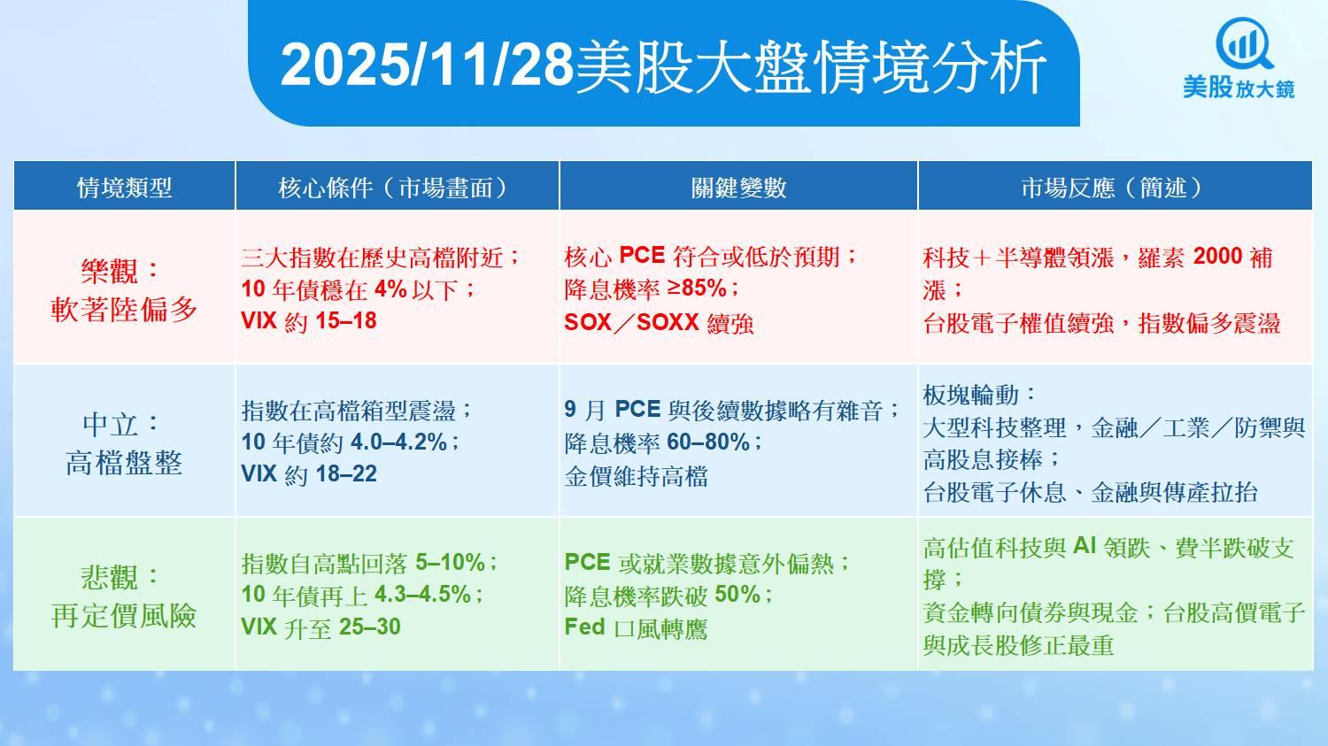 短線利率與匯市給股市的訊號依舊偏多——降息可期、經濟尚稱穩健。但由於關鍵通膨與 GDP 數據缺席,目前多半依靠模型與預估,一旦 12 月初的 PCE / 個人收入等數據「不照劇本走」,利率與股市都可能出現較大的再定價。