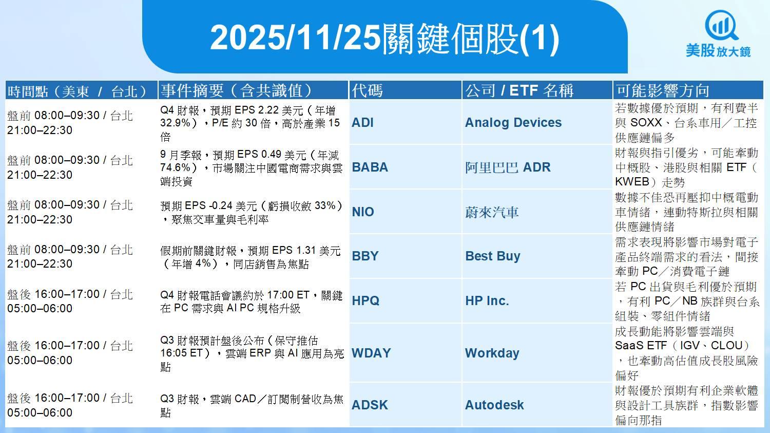 專業觀察: 今日財報橫跨 半導體、電商、電動車、PC 與雲端軟體,有機會重新塑造市場對「科技獲利是否能支撐高估值」的看法;數據若多數符合或優於預期,將有利於科技股領漲格局延續到感恩節假期後。