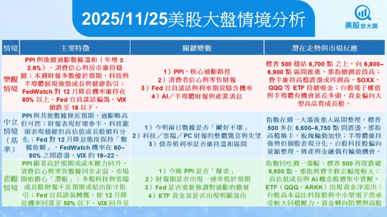 下檔風險:一旦 PPI 再度升溫或多檔科技股財報失靈,市場會快速調整對降息與 AI 成長的定價,短線回檔可能會相對集中在今年漲幅已高的科技與半導體。