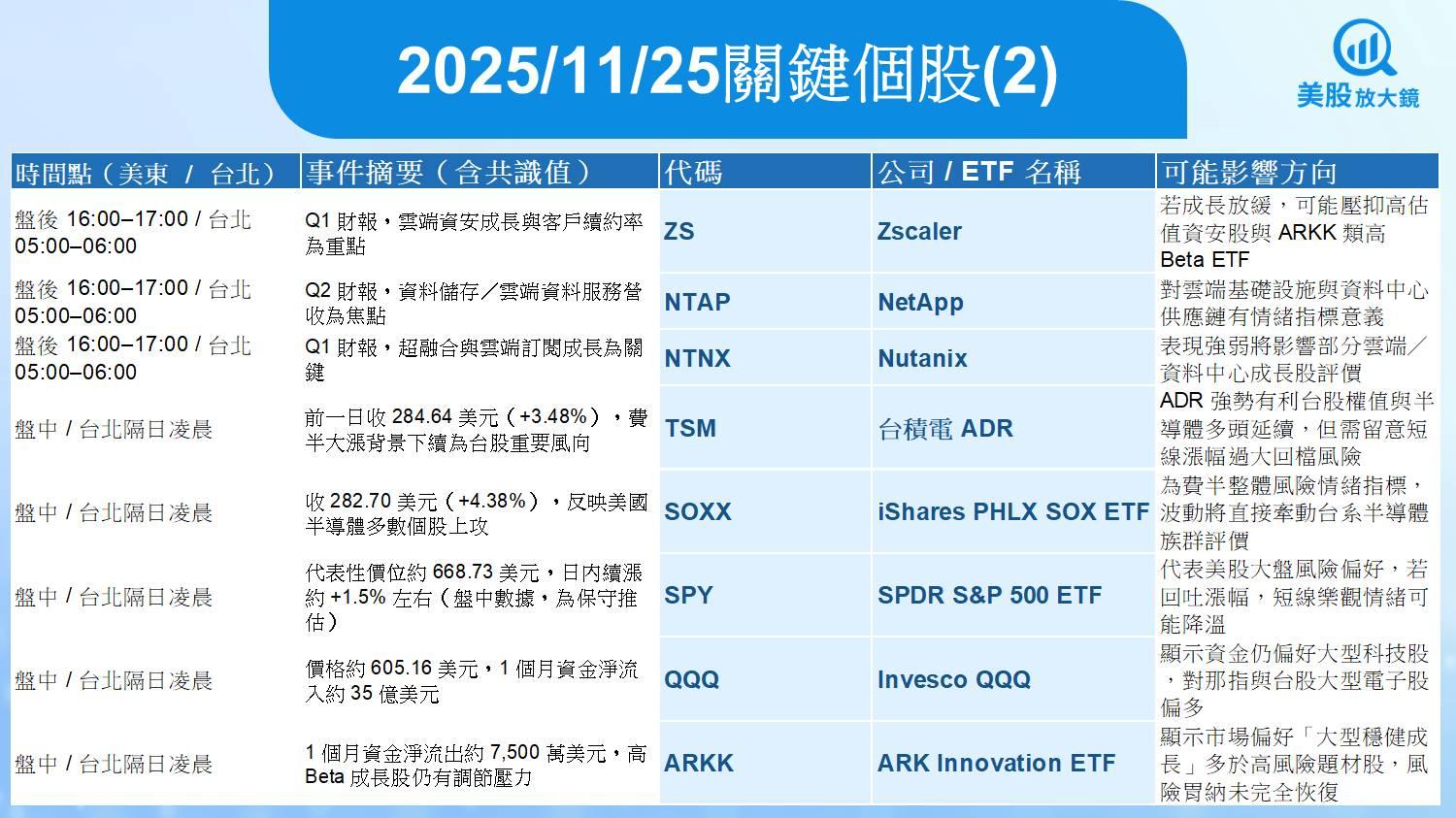 盤後(約 16:00–17:00 ET;台北 11 月 26 日 05:00–06:00)則輪到 HP(HPQ)、Dell(DELL)、Autodesk(ADSK)、Workday(WDAY)、Zscaler(ZS)、NetApp(NTAP)、Nutanix(NTNX) 等 PC 與雲端軟體/資安大咖,HP 已確認將於 17:00 ET 舉行財報會議。這批公司涵蓋 PC、企業 IT 支出、SaaS 與資安,對那指與雲端/網安 ETF(如 IGV、CLOU 等)具指標意義。