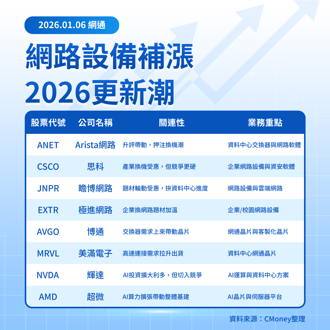 ANET 這次的重點,不只是券商把目標價上調,而是市場把 2026 定位成「網路設備更新」的主線之一;只要雲端大客戶的資料中心預算沒有縮手,網路設備很可能會接棒成為 AI 基建第二波焦點。策略上,投資人可以用族群方式追蹤,先看資金是否持續回流到網路設備與網通晶片,再決定要不要把強勢股留在自選名單、等拉回或轉強訊號出現再出手。
