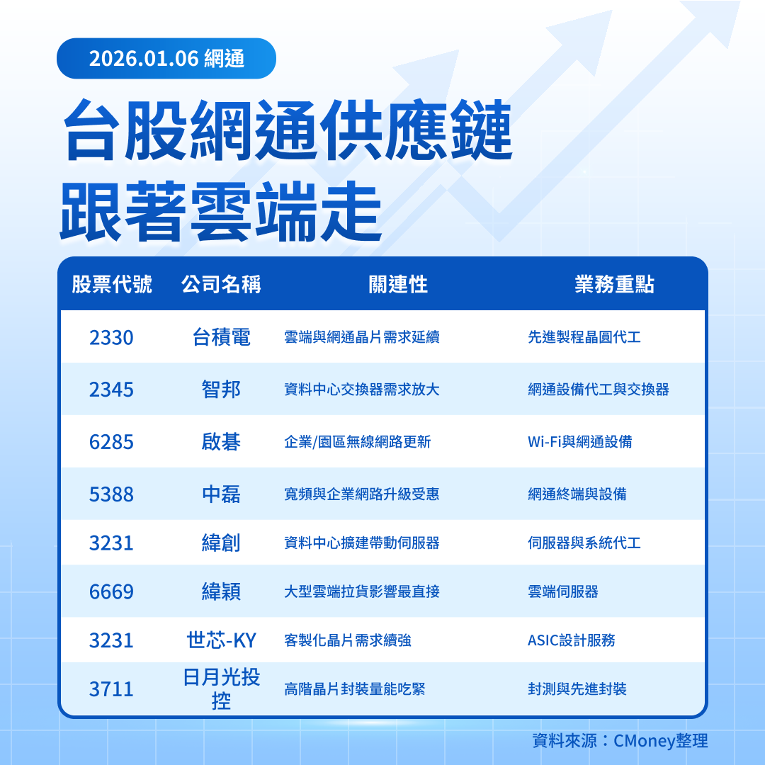 提醒投資人:後續可觀察各家公司財報展望是否同步提到「資料中心網路」預算上修,避免只有股價先反應。