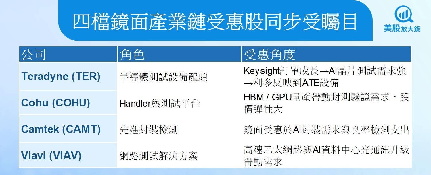 這些公司具備與Keysight類似的「鏡面 AI 曝險」結構,當主流AI晶片股波動加大時,市場資金可能轉向這類工具/驗證類股作為平衡配置。