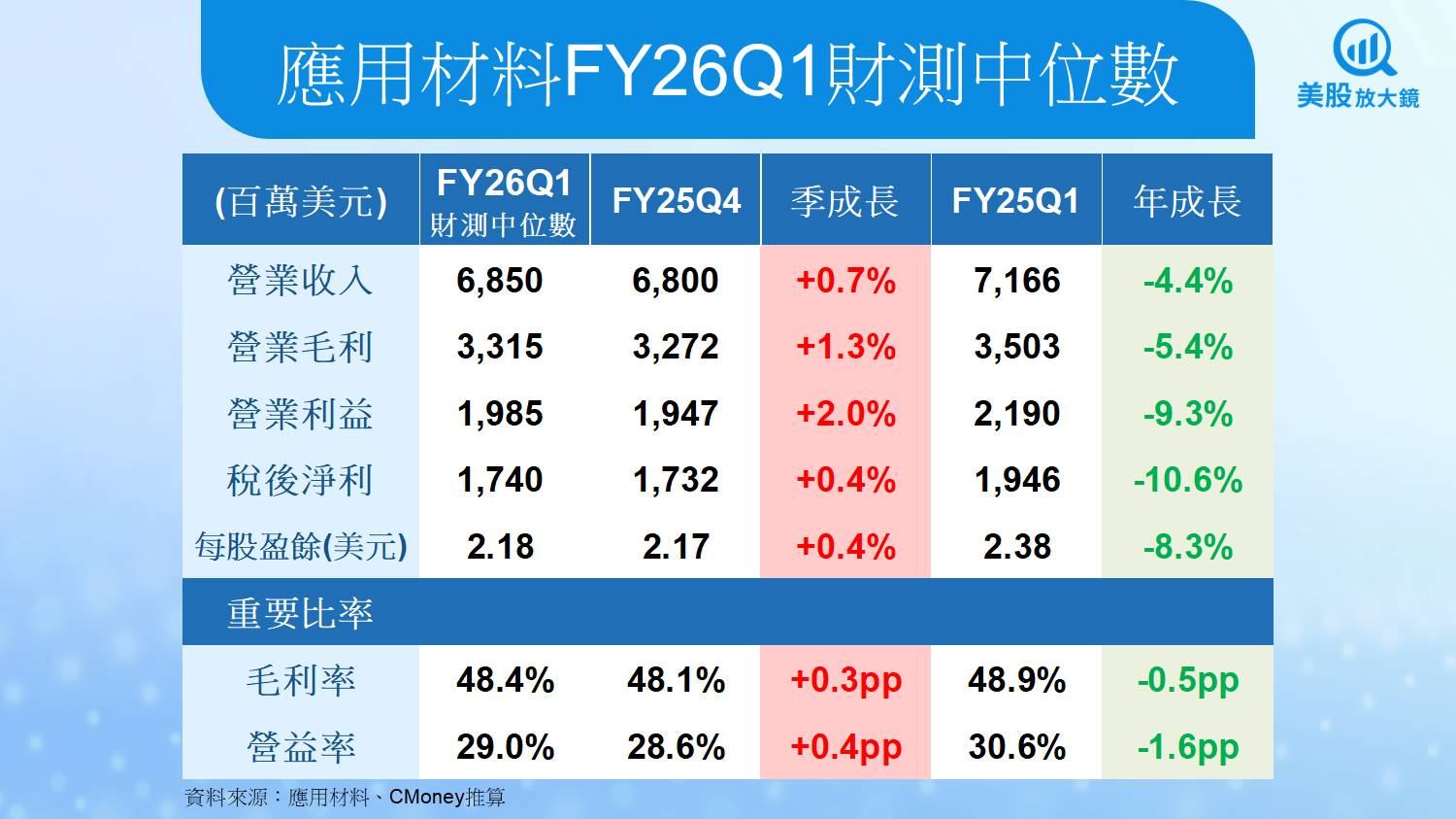 應用材料(AMAT)公布的 FY26Q1 財測中位數顯示,雖然季增動能微幅回溫,但年比仍全面下滑,突顯產業尚未擺脫修正期: