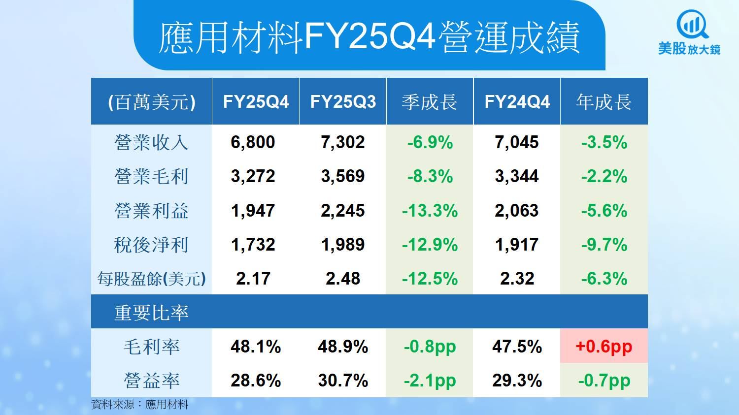 應用材料全年營收達 283.7 億美元,年增 4%;非 GAAP EPS 為 9.42 美元,年增 9%,毛利率也拉升至 48.8%,為近 25 年來高點,代表其技術競爭力與定價能力強勁。不過,單看 Q4:
